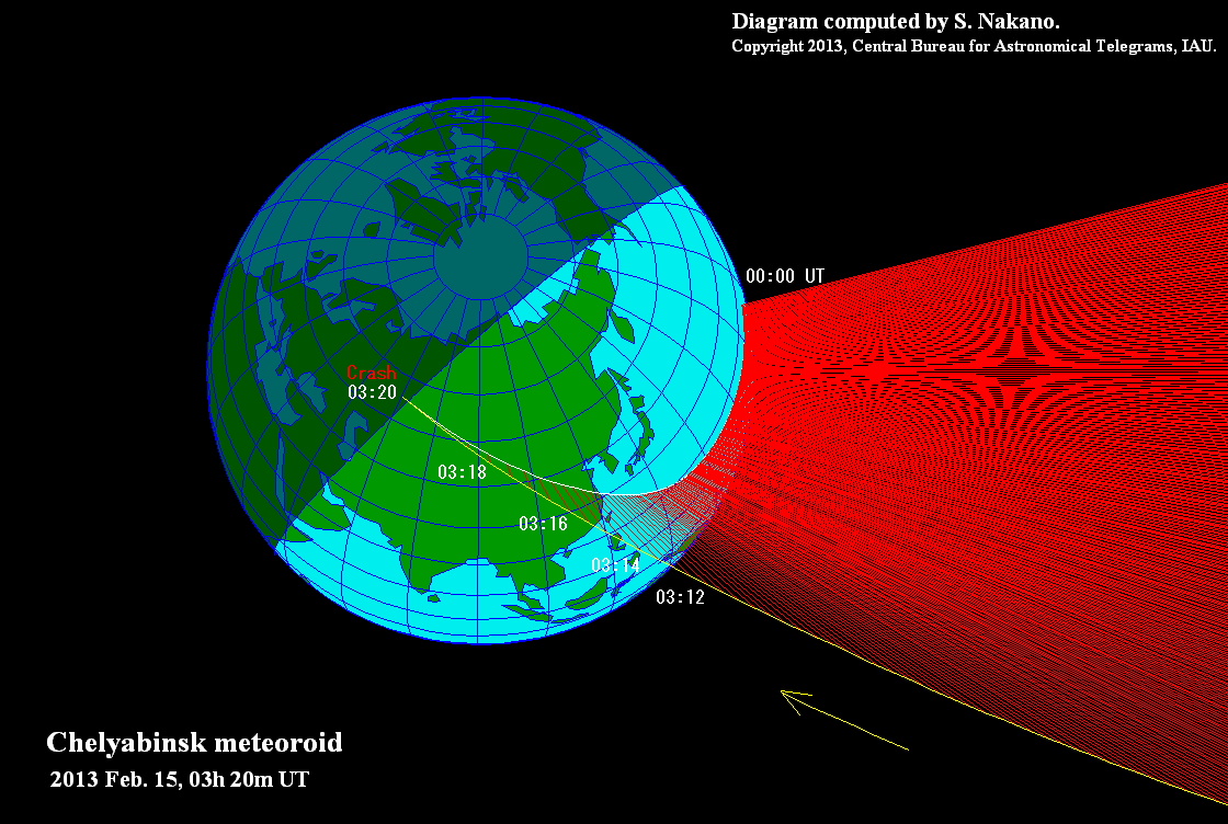 Diagram of Chelyabinsk meteoroid impact by Syuichi Nakano (Sumoto, Japan). The actual path is represented by the lower gold/yellow line with an arrow underneath; the red shading is provided to show the three-dimensional aspect to indicate the meteroid's location above the earth as it approached impact. The times given are in Universal Time (UT), the time used for practical purposes in astronomy (which is essentially Greenwich Mean Time). Nakano assumed a collision time of 2013 Feb. 15d03h20m26s UT occurring at geographical longitude 60.5 deg east, latitude = +55.5 deg, with the apparent radiant point and velocity from CBET 3423. He then performed differential correcting to yield values R.A. = 334.6113 deg, Decl. = -0.7289 deg, and velocity 13.8298 km/s for the geocentric radiant. Nakano's computed orbital elements used for the diagrams are as follows: